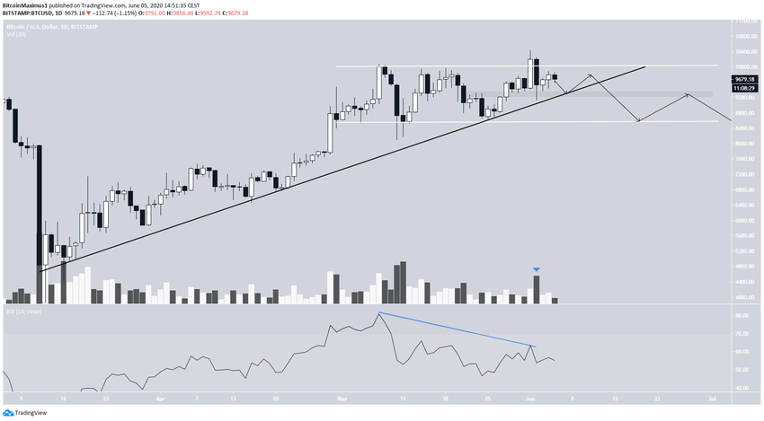 Наиболее вероятным сценарием является снижение в направлении незначительной области поддержки $9200-$9350, которая укреплена также линией восходящей поддержки. Отсюда цена может совершить отскок, а затем снова снизиться. Это завершило бы фазу «Признак слабости», описанную нами выше.