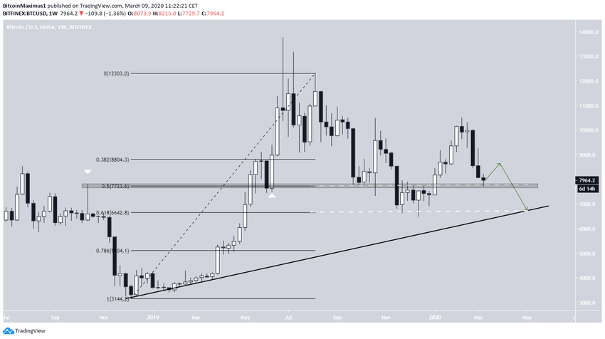 Это означает, что наиболее подходящей областью для разворота тренда может стать область $6700-$6900. В случае ее пробоя цена может уйти к $5000.