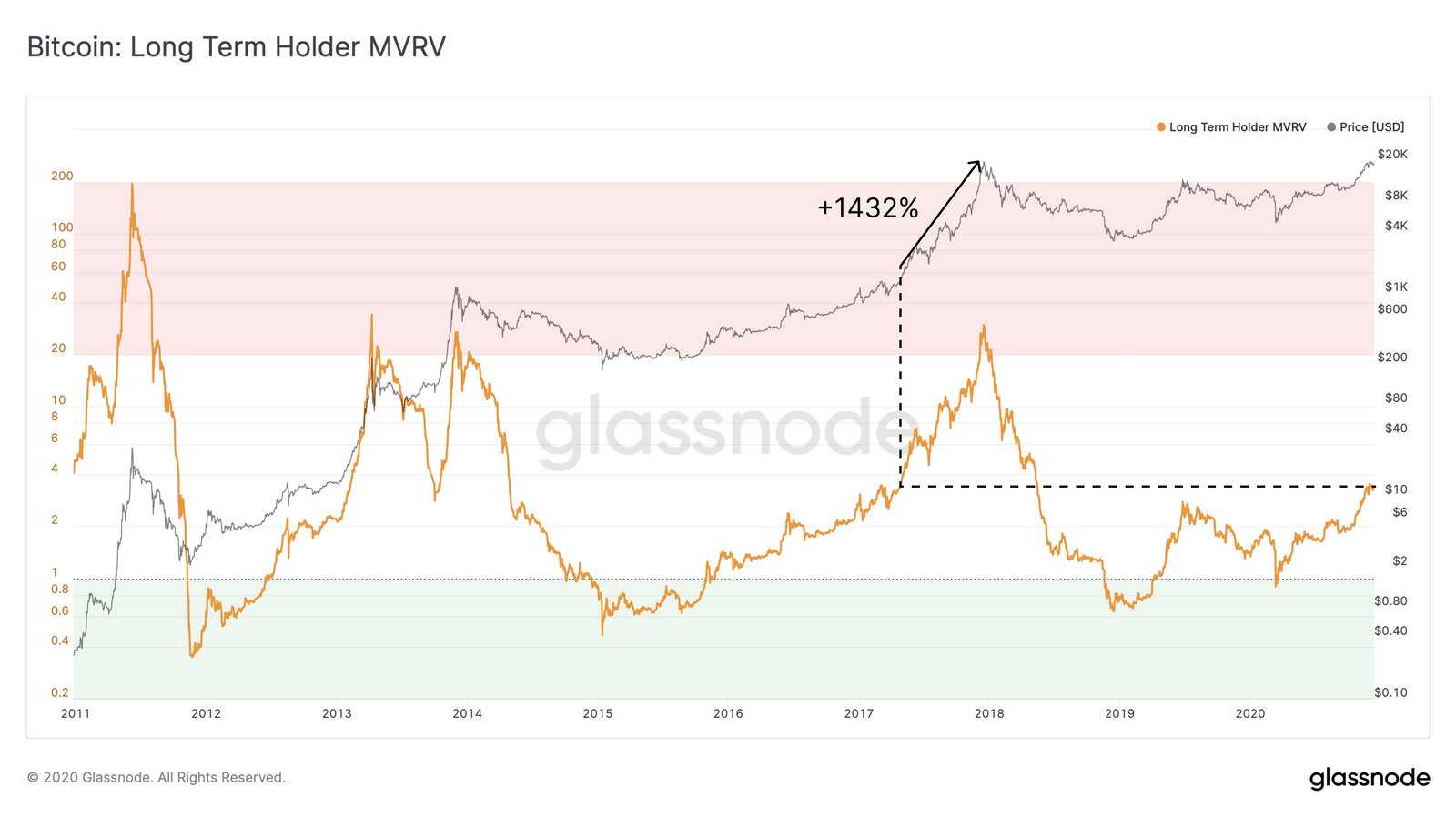 Специалисты Glassnode отмечают, что последний раз индикатор LTH-MVRV был таким низким во время бычьего тренда, когда цена BTC едва превышала $1000, а позже выросла на 1432% до рекордного максимума вблизи $20 000.