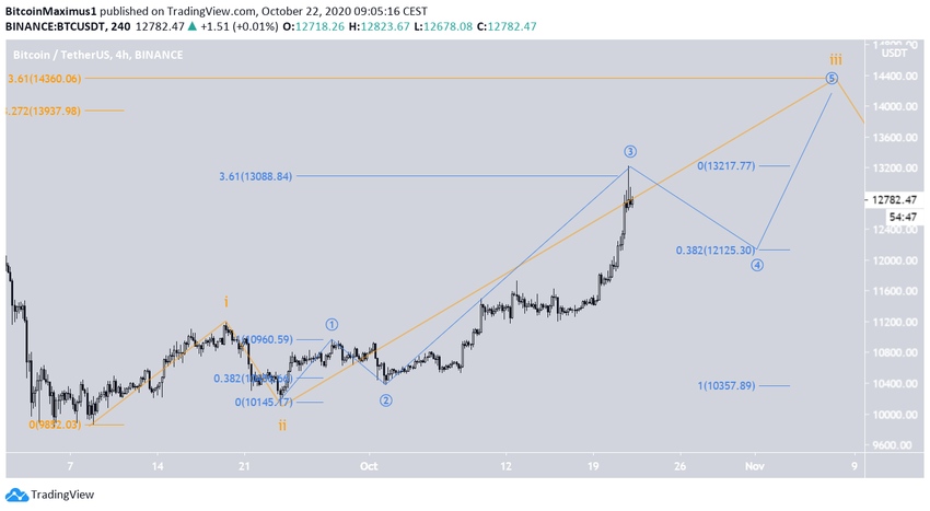 Похоже, что 8 сентября биткоин начал формирование бычьей импульсной структуры (оранжевый цвет на графике внизу) и сейчас находится внутри 3-й волны. Наиболее вероятным уровнем ее завершения может стать уровень Фибо 3.61 расширения волны 1, проходящий на $14 360.