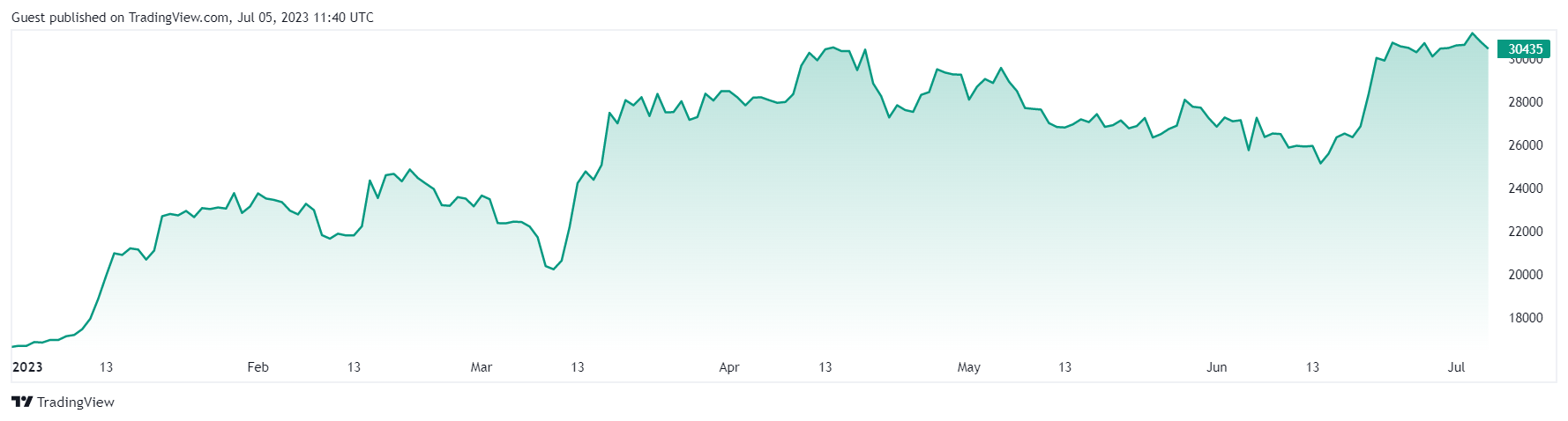 Цена биткоина (BTC) в торговой паре BTC/USD по состоянию на июль выросла на 83% до $30 381, по данным TradingView. По своей окупаемости криптовалюта обогнала сразу несколько американских биржевых индексов за первое полугодие 2023 года.