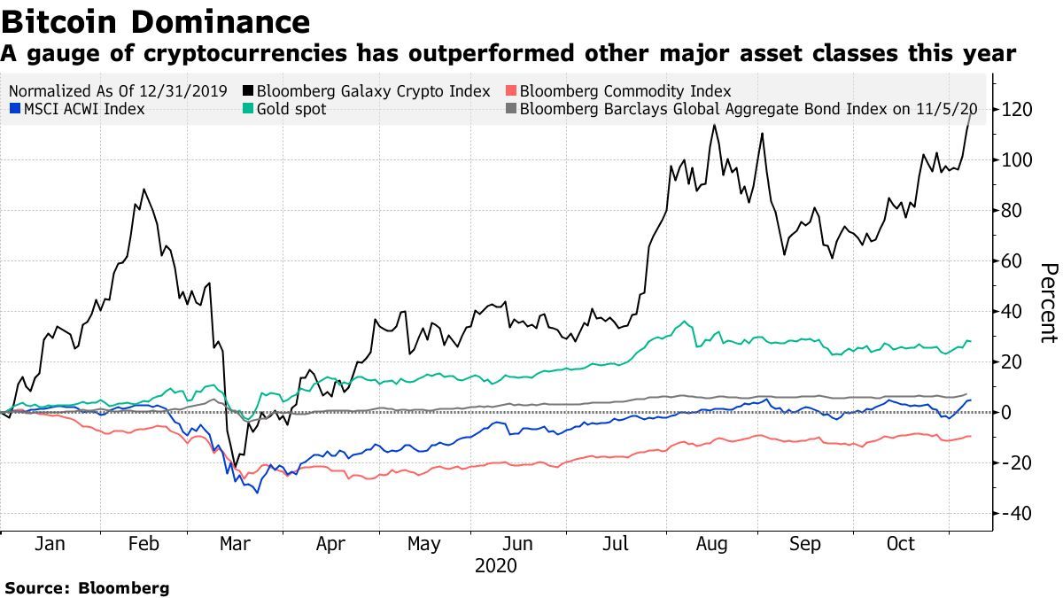 Рост цены биткоина во время президентских выборов в США привел к тому, что в этом году криптовалюты опередили по окупаемости традиционные активы вроде золота. Об этом сообщает издание Bloomberg. Индекс Bloomberg Galaxy Crypto, сфокусированный на криптовалютах, вырос примерно на 120% в 2020 году, что превышает показатели роста золота в четыре раза.