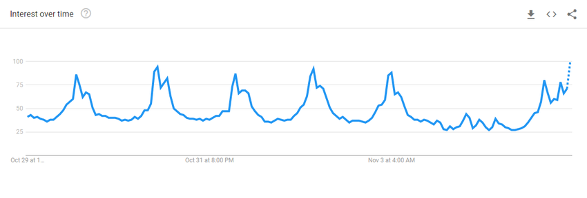 Согласно последним данным Google Trends, за последние 7 дней пользователи снова начали активнее забивать в поисковик запрос «биткоин», причем 5 ноября число запросов достигло пикового максимума месяца.
