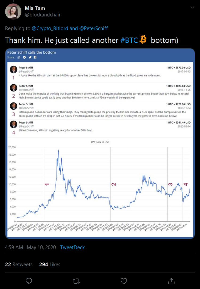 Неудивительно, что известный биткоин-ненавистник Питер Шифф не мог обойти вниманием такой примечательный повод. Он сразу же поспешил заявить в Twitter, что спекулянты начали избавляться от биткоинов, не сумев даже дотерпеть до самого халвинга.