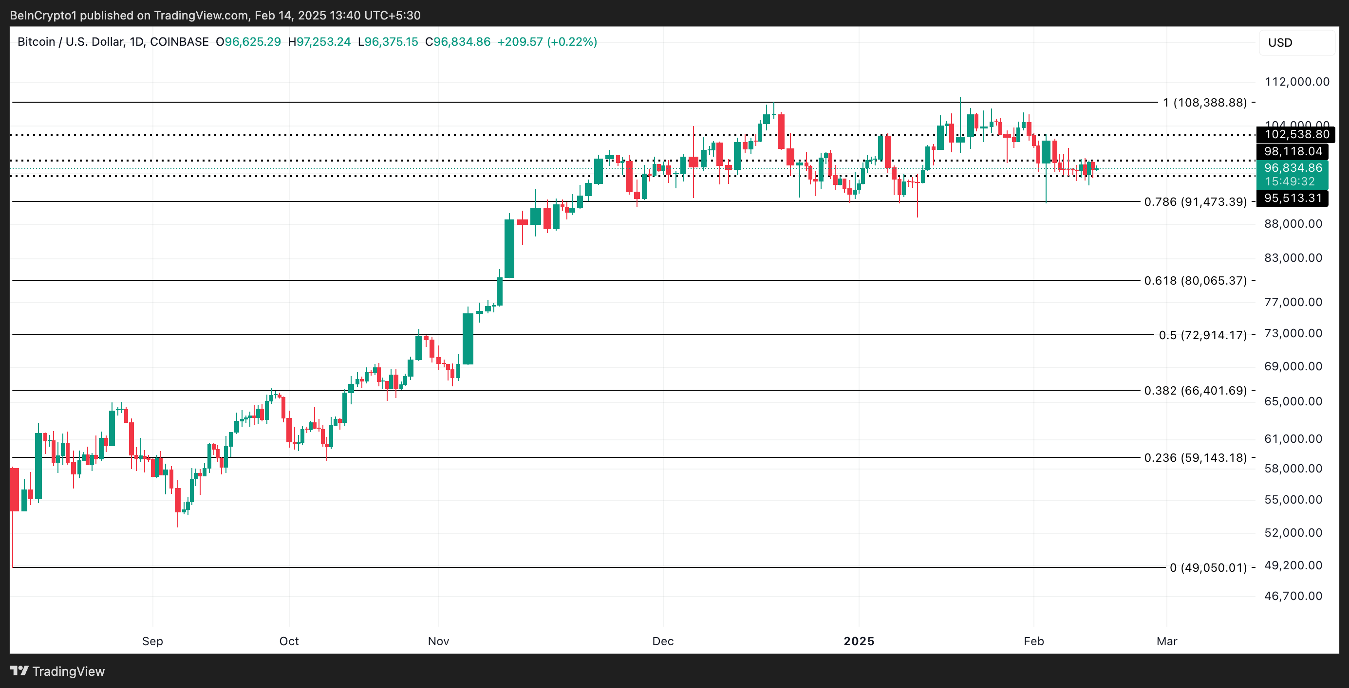 На момент написания этого анализа BTC торгуется по $97 078. За последние сутки коин прибавил в цене незначительные 0,9%.
