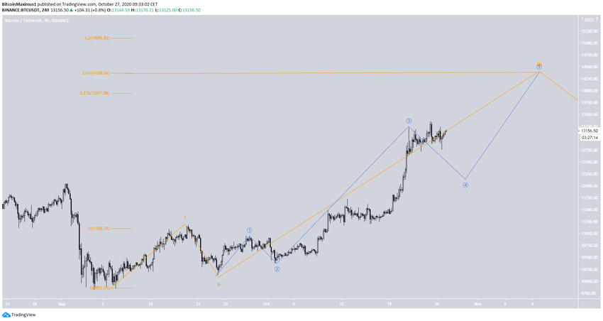 Похоже, что 7 сентября курс BTC начал бычий импульсный ход (оранжевый цвет на графике) и сейчас находится внутри 3-й волны. Предварительной целью этой волны является $14,360 (уровень Фибо 3.61 длины волны 1).