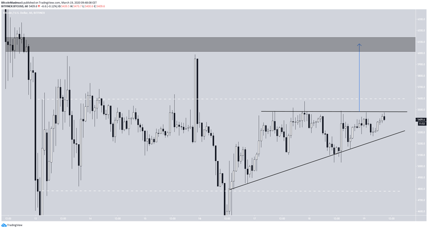 Биткоин торгуется в диапазоне $4400-$5600. С 16 марта цена приподнялась ближе к верхней границе этого канала и сформировала восходящий треугольник.