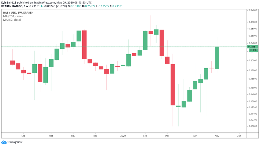 BAT, собственный токен браузера Brave, тоже устроил ралли на 35%. Валюта оттолкнулась из области $0.185 и почти достигла $0.25. Для сравнения, исторический максимум по Basic Attention Token был достигнут в начале 2018 года, и сейчас просадка рынка от этого уровня составляет «всего» 70%.