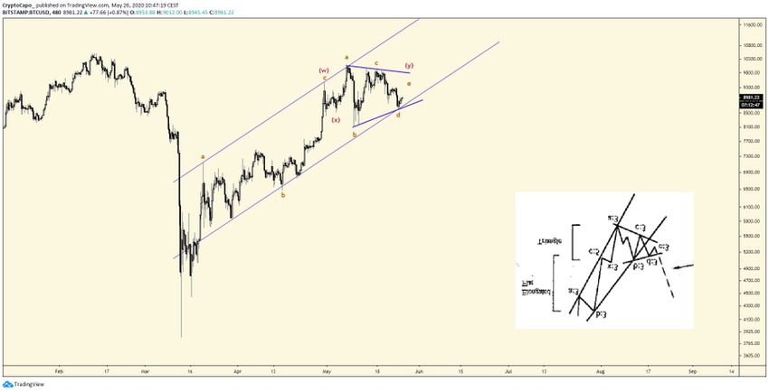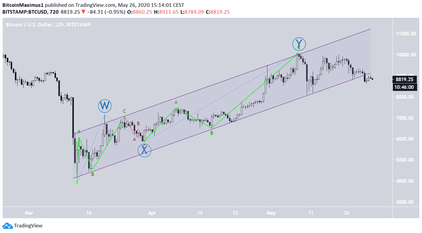 SponsoredНа приведенном ниже графике мы представили возможную волновую структуру, построенную от минимума 13 марта, в рамках которой курс биткоина уже завершил коррекцию W-X-Y. Мы можем построить параллельный восходящий канал, который соберет все максимумы и минимумы, однако BTC только что совершил его медвежий прорыв.