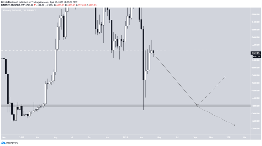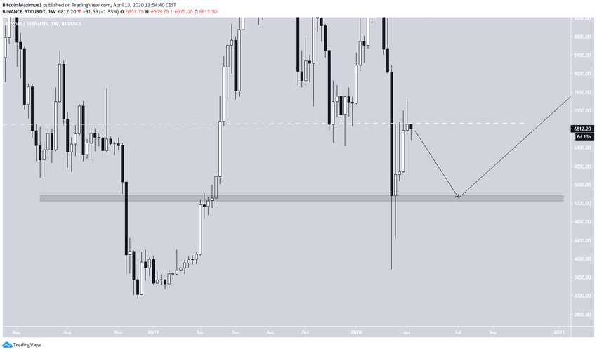Согласно второму варианту, цена нащупает поддержку в районе $5400. Этот сценарий можно назвать «сценарием двойного дна», поскольку снижение биткоина к этому уровню обусловит формирование двойного основания, если опираться на уровни закрытия на недельном графике. Мы уже рассматривали подобную вероятность в своем недавнем анализе.
