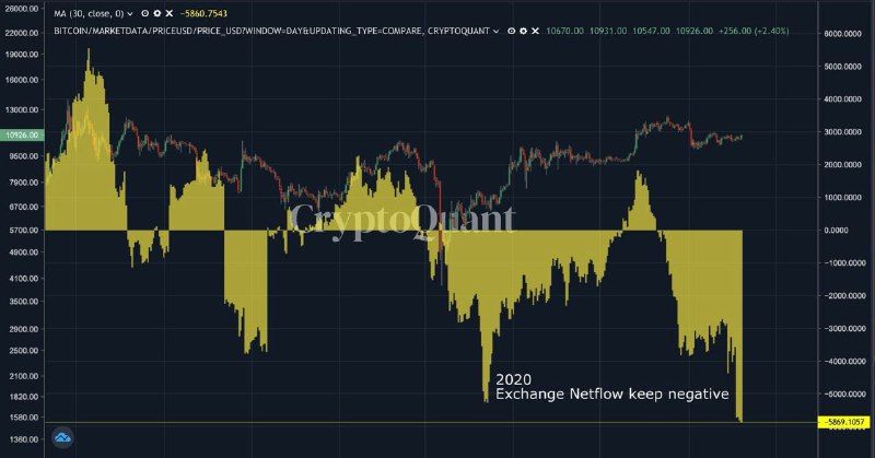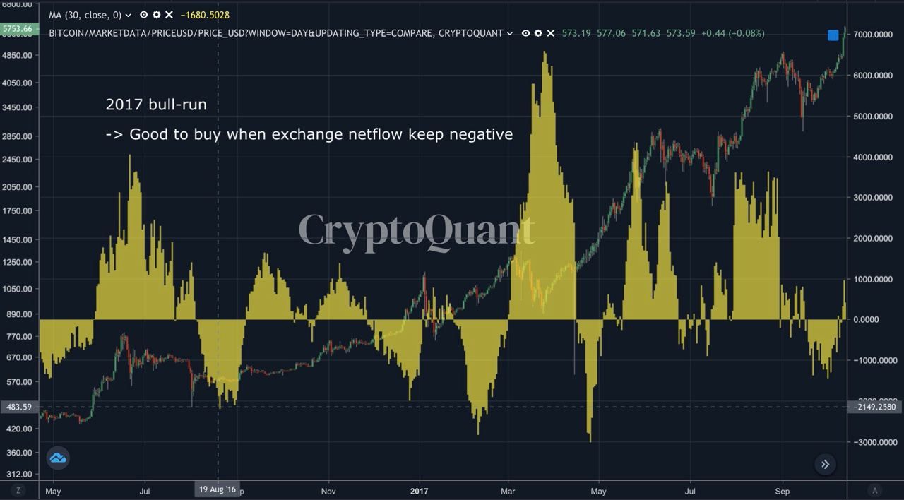 В последний раз чаще всего негативный поток биткоина на биржах наблюдался в середине 2017 года перед формированием исторического ралли.