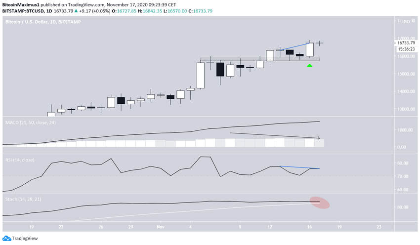 Несмотря на наличие бычьей свечи и превращение в поддержку области $15 800, технические индикаторы на дневном графике все равно начали демонстрировать признаки ослабления.