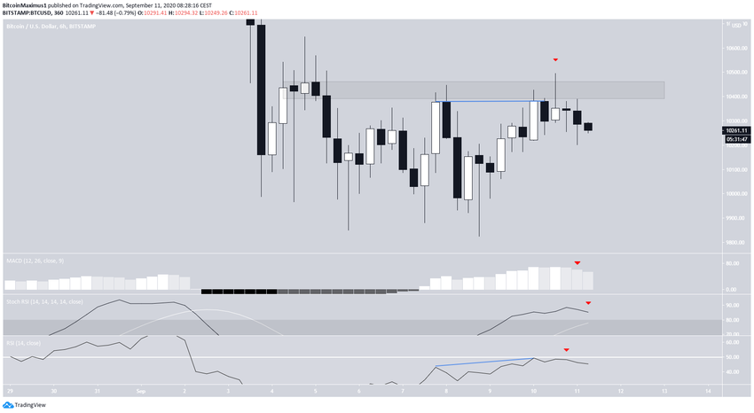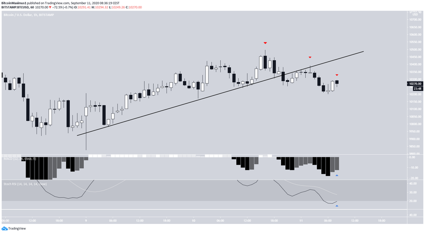 Курс биткоина (ВТС) отметил 5 сентября минимум на $9825, после чего начал укрепляться. На протяжении недели цена трижды отскакивала от области $10 450, сформировав здесь уровень незначительного сопротивления. Кроме того, на свечном графике появилась модель «падающая звезда». Она считается моделью медвежьего разворота, если формируется после роста.