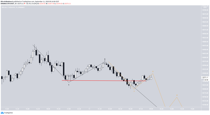 Более краткосрочный таймфрейм демонстрирует, что снижение было скорее коррективным. Это поддерживает шансы биткоина на рост в направлении $10 800, где цена сформирует максимум и затем упадет к $9600.