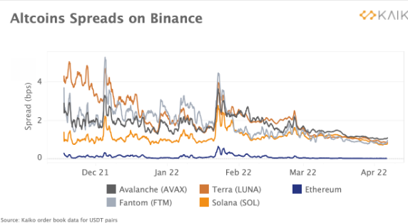 Тем не менее за последние несколько месяцев для активов в паре с USDT на Binance ситуация начала изменяться, утверждают аналитики. В частности, в Kaiko заметили, что с декабря 2021 года спреды для terra (LUNA) сократились вдвое, а для avalanche (AVAX) и fantom (FTM) — на базисный пункт. Спреды у solana (SOL) остались относительно неизменными.
