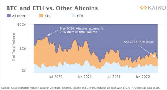 SponsoredКак видно на графике выше, доля альткоинов (за исключением ether) за два года выросла с 23% до 71%. При выборке учитывались все торговые пары на Binance, Coinbase, Kraken и Gemini. Впрочем, независимо от падения доли, биткоин (BTC) и ether (ETH) остаются самыми ликвидными криптоактивами, предлагающими легкую точку входа на рынок, признают в Kaiko.