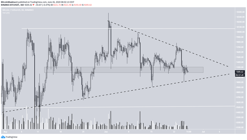 Кроме того, цена, вероятно, торгуется внутри симметричного треугольника. Далее все будет зависеть от того, какая из границ этого треугольника будет пробита. Медвежий или бычий прорыв направят рынок к минимуму или максимуму текущего диапазона на $8500 или $10 050, соответственно. Линии сопротивления и поддержки треугольника расположены сейчас на $9500 и $9000.