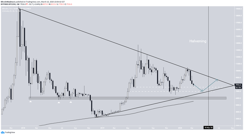 В этой связи более логичным сценарием стало бы снижение к $7000, тестирование недельной поддержки и линии восходящей поддержки треугольника, а затем – бычий прорыв. Эту вероятность также подкрепляет грядущий в мае халвинг в сети биткоина.