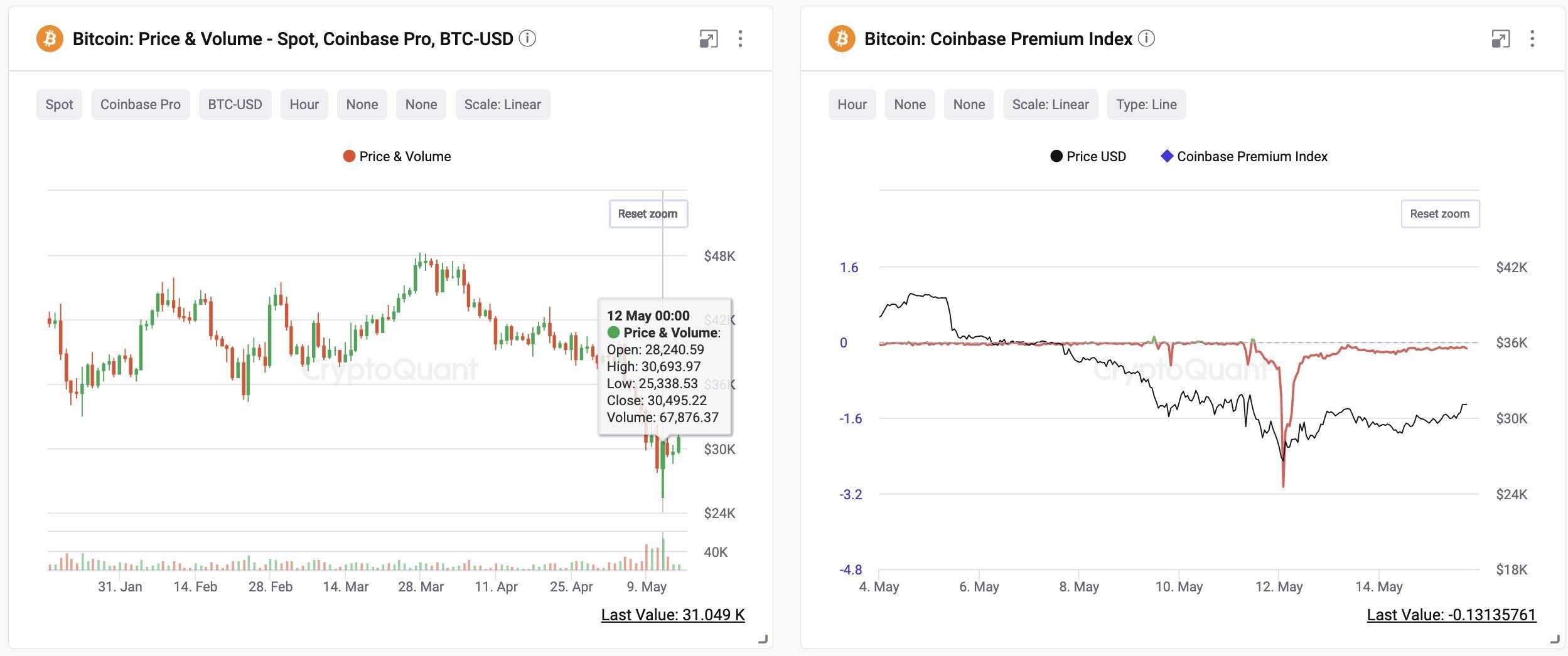 Тогда же на централизованных биржах был замечен приток биткоина. Например, 11 мая на Coinbase поступило свыше 5440 BTC, а на Bitfinex и вовсе более 15 533 BTC. У Binance, наоборот, зафиксирован отток в 18 617 BTC. За прошедшие 30 суток на все перечисленные биржи поступило более 25 000 BTC.
