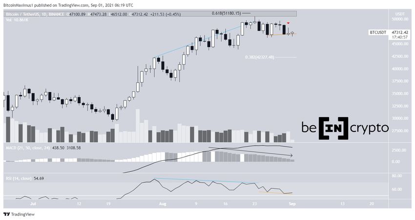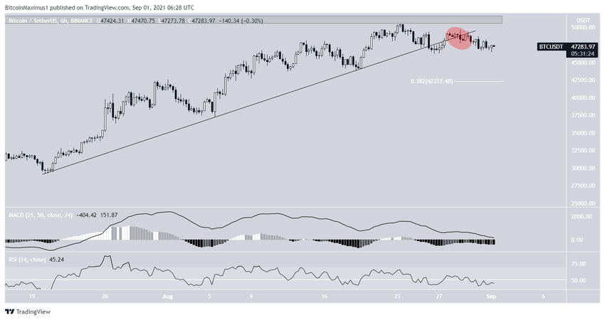 Биткоин (BTC) начал расти 31 августа и достиг локального максимума на уровне $48 246. Однако закрепиться на новых позициях и развить бычий тренд не удалось. В результате на графике появилась свеча с длинной верхней тенью