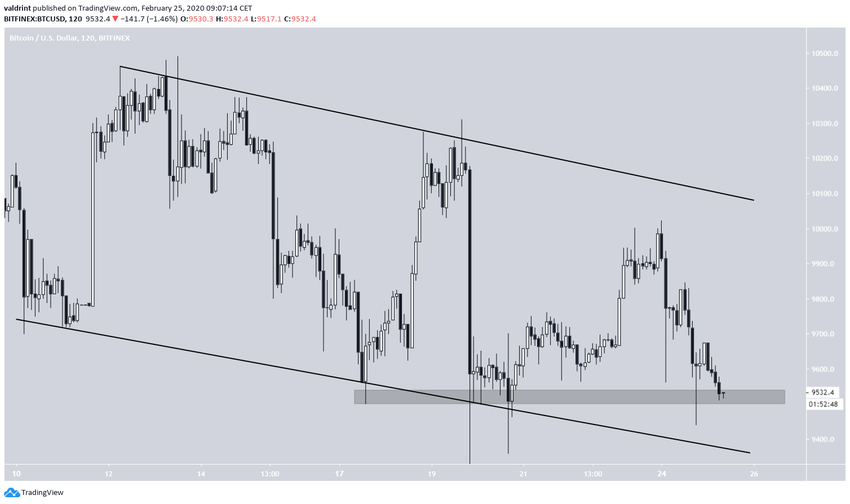 На краткосрочном таймфрейме курс биткоина с 10 февраля торгуется внутри нисходящего канала. Сейчас цена находится внутри области незначительной поддержки $9,500, также держась очень близко к линии нисходящей поддержки. Кроме того, на свечном графике сформировалось несколько длинных нижних фитилей, что указывает на давление со стороны покупателей.
