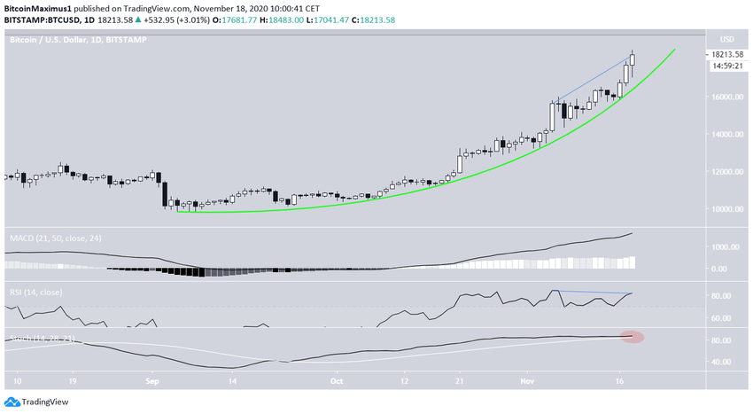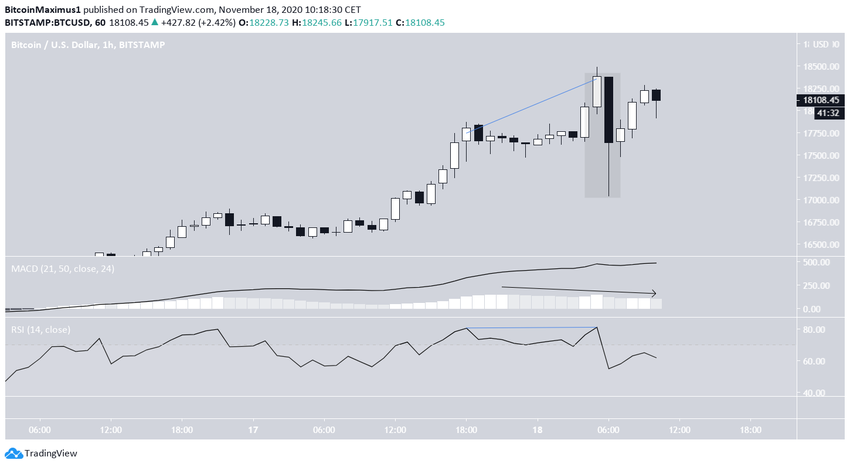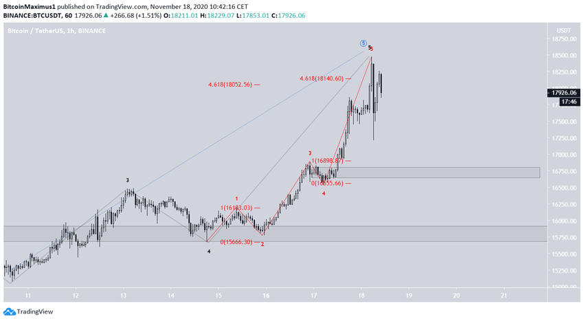 Биткоин взлетел к максимуму $18 476, от которого затем резко отскочил. Пока неясно, достиг ли BTC вершины, но в ближайшее время следует ожидать отката.