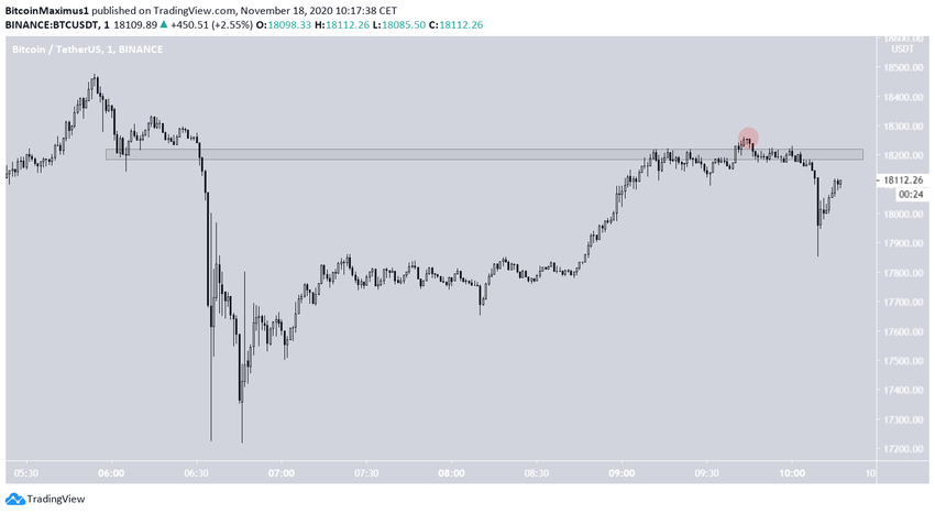 На минутном графике обрисовывается более медвежья картина. После массивного обвала цена вернулась в район $18 250, который до этого выступал в роли поддержки, но теперь стал сопротивлением. Попытки заглянуть выше него обернулись последующим откатом.