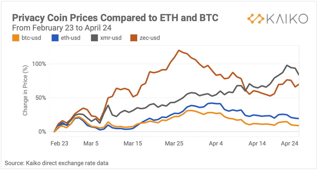 Два крупнейших по капитализации альткоина с упором на конфиденциальность, monero (XMR) и zcash (ZEC), обогнали биткоин (BTC) и ether (ETH) по процентному приросту. Об этом у себя в блоге сообщили аналитики Kaiko.