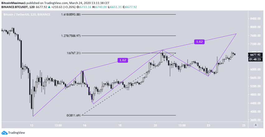 Первым вероятным паттерном в нашем анализе станет «трехшаговый паттерн» (three drive pattern). Его заметил криптовалютный трейдер ACX (@ACXtrades), который и поделился этим графиком в Twitter. По его мнению, этот паттерн должен привести цену к $7648.