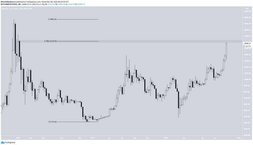 Курс биткоина (ВТС) приближается к важной области сопротивления на $16 145. Оно представлено уровнем Фибо 0.786 коррекции всего предыдущего снижения и областью бывшего сопротивления.