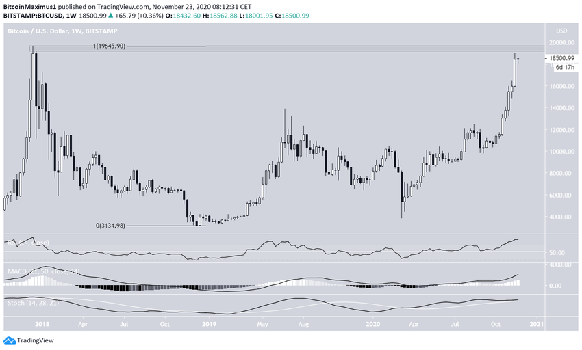 Цена приближается к важной области сопротивления $19 645, в районе которой располагается рекордный максимум, отмеченный биткоином в декабре 2017 года.