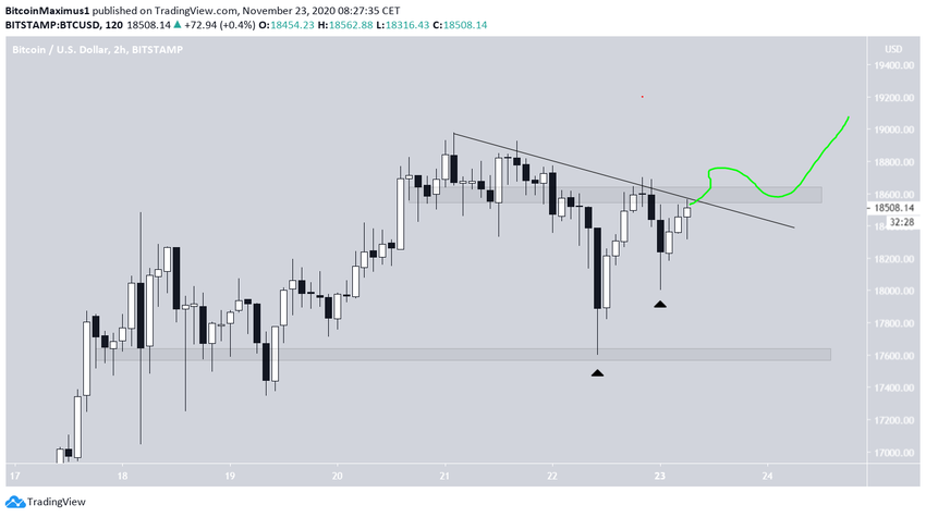 На 2-часовом графике можно увидеть торговый диапазон $17 600-$18 600. Сначала цена отскочила от области сопротивления, но, достигнув поддержки, сформировала очень длинный нижний фитиль, а затем отметила на графике повышающийся минимум (черные стрелки на графике).