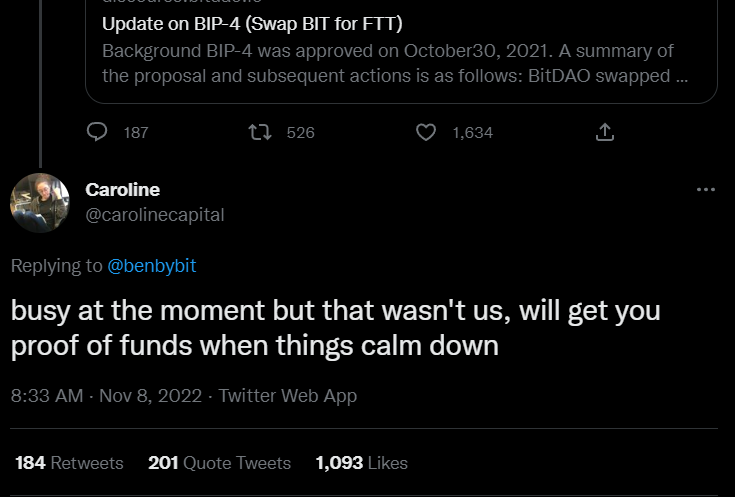 Тем временем в сообществе выяснили, что Alameda уже перевела на FTX как минимум 4,6 млн BIT на сумму в $1,6 млн. Глава Alameda Research Каролайн Эллисон написала в твиттере, что торговая фирма не переводила токены BIT на FTX.