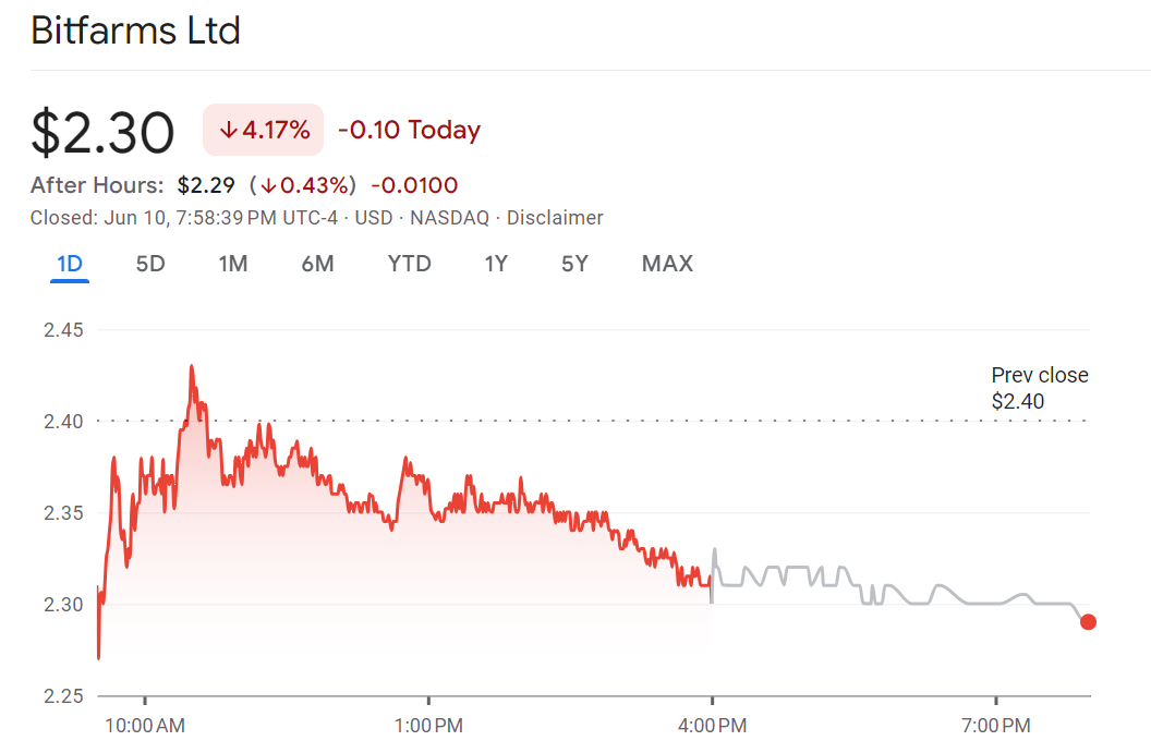 После новости о принятии плана защиты акционеров котировки акций Bitfarms (BITF) на Nasdaq упали на 4,17%. В то же самое время цена акций Riot Platforms (RIOT) выросла на 1,8%.