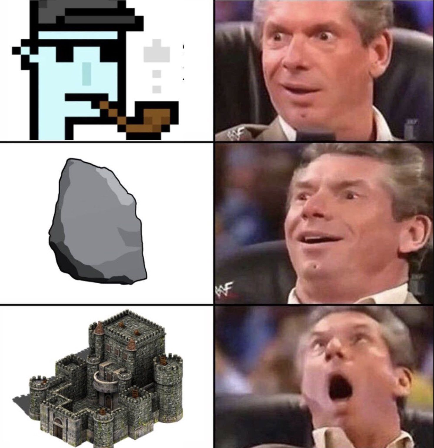 Не обошлось на этой неделе и без NFT-мемов. Участников криптосообщества рассмешила смена хайповых трендов на рынке невзаимозаменяемых токенов. Сначала все активно обсуждали пиксельные NFT из коллекции Cryptopunks. Потом в тренды ворвались токены с изображением камней. Им на смену пришли токены со средневековыми замками из игры Realms of Ether.
