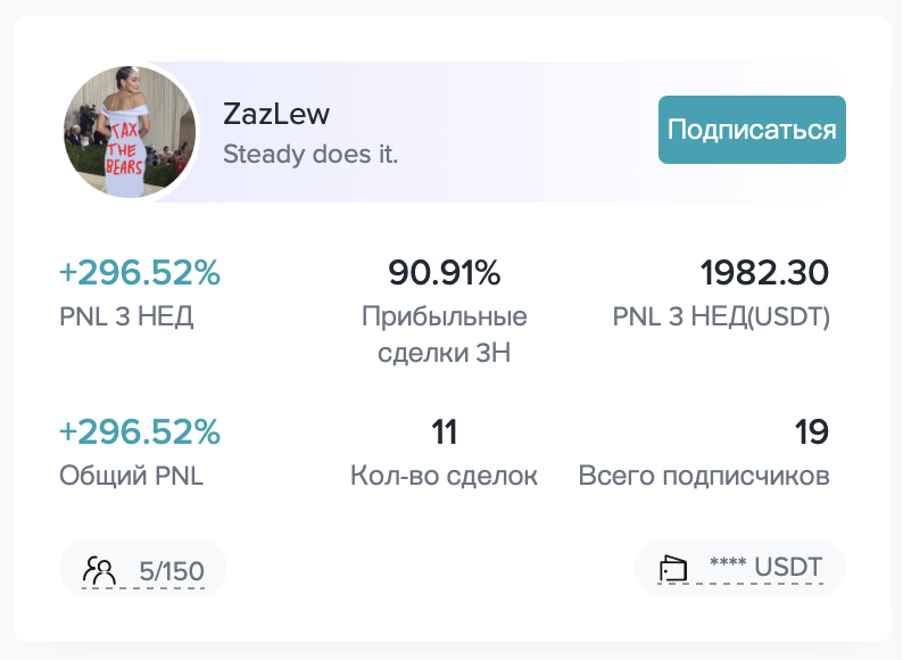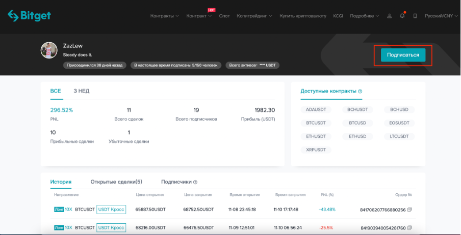 Вы можете подписаться на профессиональных трейдеров, у которых есть доступные слоты, нажав кнопку «Подписаться» в правом верхнем углу.