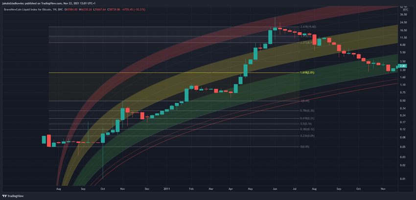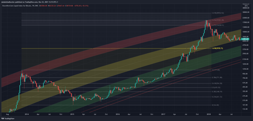 Рост в рамках цикла был гораздо более стабильным по сравнению с предыдущими эпизодами. Однако и здесь мы можем увидеть период консолидации BTC в желтой полосе и в районе уровня Фибо 1.618 на $3978. После его чистого бычьего прорыва рост цены снова ускорился по экспоненте в последней фазе цикла.