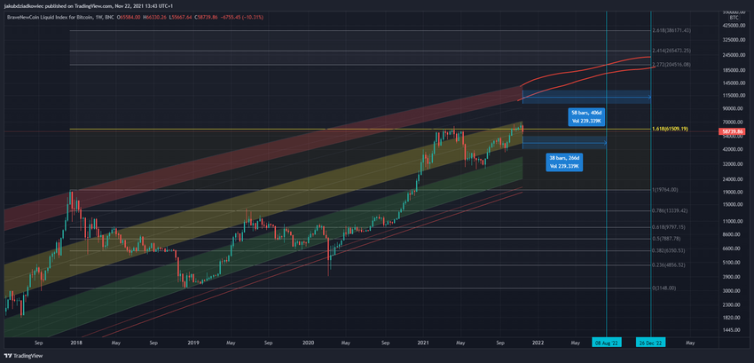В текущем цикле, в период с октября 2020 года по апрель 2021, года цена BTC быстро выросла до области желтой полосы. Затем последовала 3-месячная коррекция и возобновление восходящего тренда, что снова привело цену к верхней границе желтой полосы.