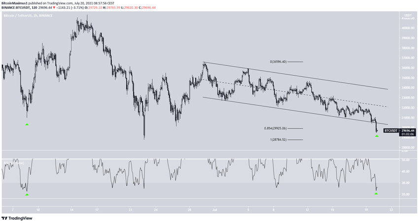 Двухчасовой индекс RSI сигналит о сильной перепроданности, находясь сейчас на 23. Это минимальное значение с 8 июня, за которым последовал рост на 30+%.