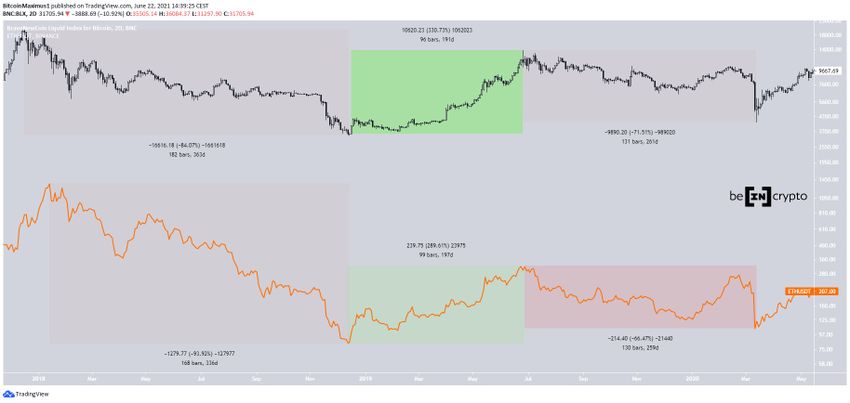 Впоследствии BTC вырос на 330% за 191 день, в то время как аналогичные показатели ETH составили 290% и 197 дней. Отчасти это компенсировало неравенство в показателях, отмеченное выше.