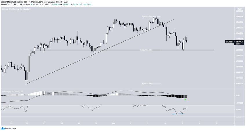Впрочем, несмотря на снижение, биткоин (BTC) нащупал поддержку в области $53 000 (уровень коррекции Фибо 0.5) и оттолкнулся от нее.