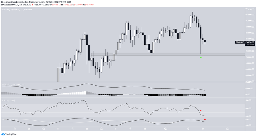 Биткоин (ВТС) снижается с 14 апреля. Темпы падения ускорились 18 апреля, обусловив просадку цены к минимуму на $50 931.