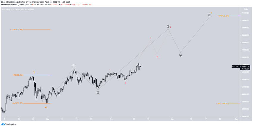 Более детальное рассмотрение демонстрирует, что биткоин находится в более второстепенной подволне 3 (черный цвет). Результаты анализа самых краткосрочных таймфреймов представлены красным цветом.
