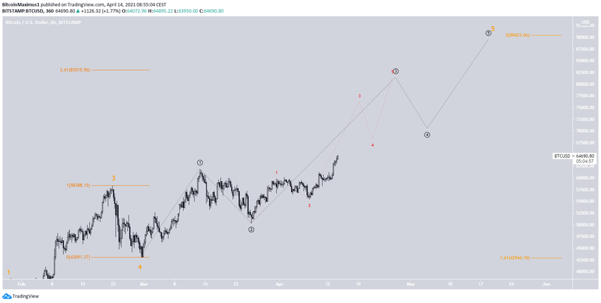 Результаты волнового анализа предполагают, что курс BTC находится в более второстепенной подволне 3 (черный цвет) подволны 5 (оранжевый цвет). Потенциальной целью и вершиной этого хода является область $83 000-$90 423.