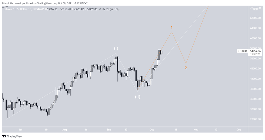 Скорее всего, BTC сейчас находится в пределах волновой формации 1-2/1-2. Таким образом, цена прошла только первую стадию роста, за которой последует новый еще более масштабный этап.
