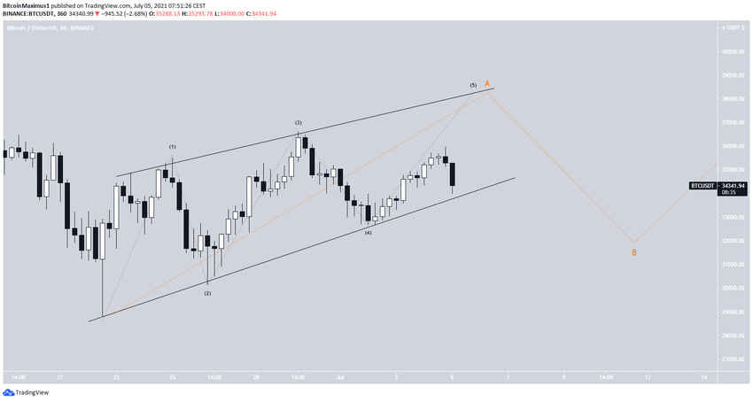 Альтернативный бычий сценарий предполагает, что биткоин рос в рамках начальной диагонали (leading diagonal). В этом случае BTC может достичь максимумов в области $37 500 и лишь после этого начать снижение.