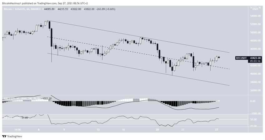 Биткоин снижается с тех пор, как совершил медвежий пробой линии восходящей поддержки и превратил ее в сопротивление. Кроме того, цена отскочила от медвежьей линии супертренда (красная линия).