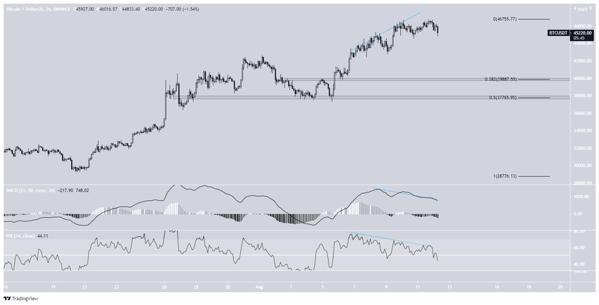 Биткоин достиг 11 августа максимума на $46 743, но почти сразу же откатился. Текущему снижению предшествовали сигналы ослабления на краткосрочных графиках, после чего BTC совершил медвежий прорыв «восходящего клина».