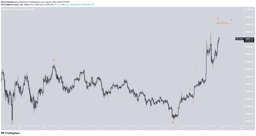 Волновой анализ предполагает, что биткоин находится в волне С (оранжевый цвет) коррекционной структуры A-B-C. Результаты подволнового анализа представлены красным цветом, и они демонстрируют, что BTC завершил откат 4-й волны и теперь находится в подволне 5.