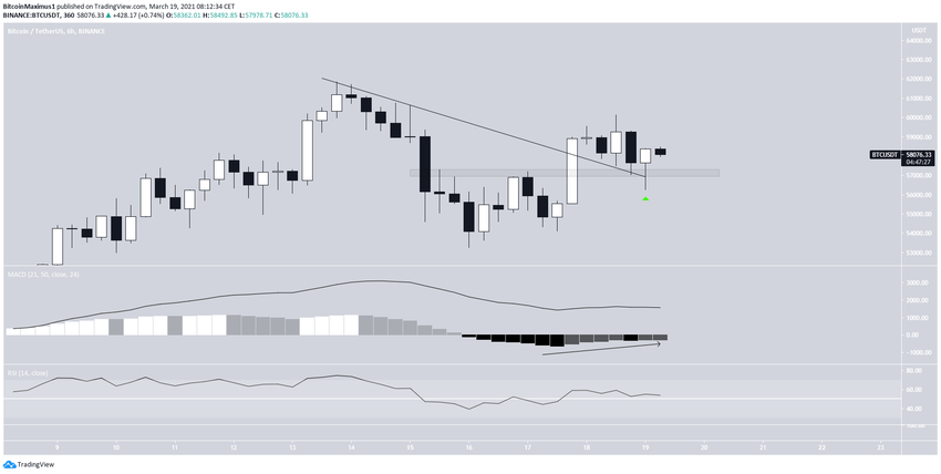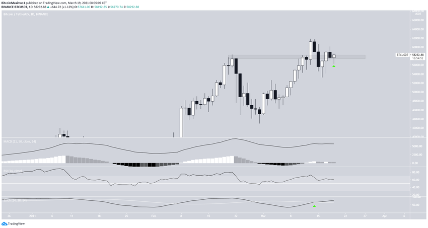 Сегодняшняя ценовая динамика является очень важной. Биткоин пытается закрепиться над областью $57 800, которая ранее представляла собой исторический максимум. Если сегодня цене удастся завершить дневные торги выше этого уровня, это подтвердит, что данная область теперь превратилась в поддержку.